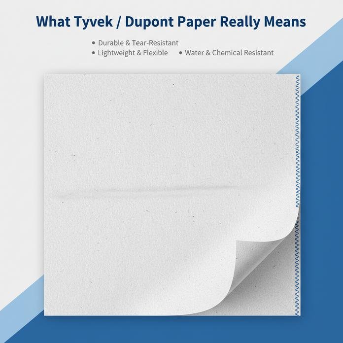 Tyvek is a DuPont material made from flash-spun high-density polyethylene fibers—lightweight, tough, and known for strong tear resistance.